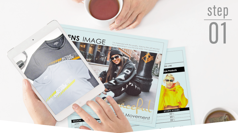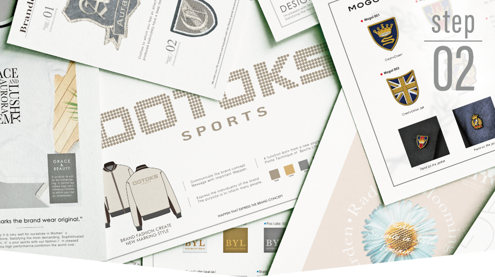 お客様のブランドに向けて、新しい企画をご提案します。ウェアへの刺繍・プリント・転写加工から、ワッペンや織ネームなどの副資材まで、当社の「ファッションMAP」を基にディスカッションを行います。お客様のイメージやご要望を十分にお伺いし、次回の打ち合わせまでに新たな提案やサンプルをご用意いたします。