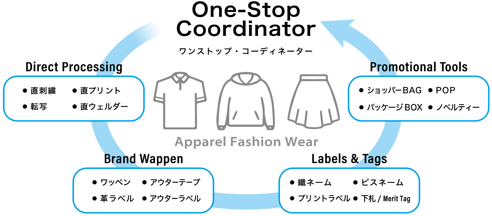 アパレル副資材からウェアへのダイレクト加工まで、一気通貫でコーディネート。