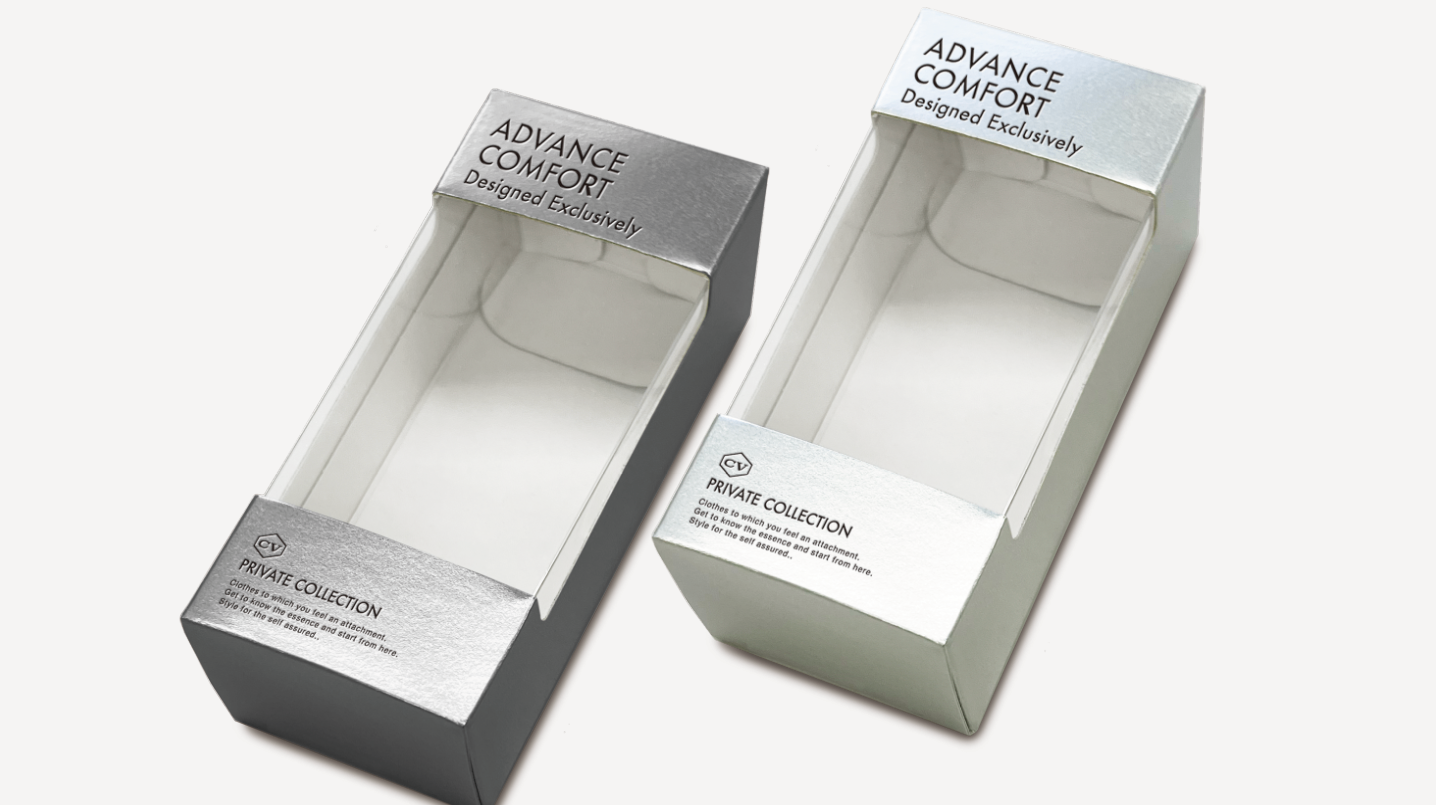 外装には上質な質感のシルバー紙(メタリックボード)を使用し、表面ロゴには深みのある黒箔押しを施すことで、ブランド価値を高めるプレミアムな印象を演出しています。中の商品が美しく際立つよう設計されており、ブランドイメージを最大限に高める仕上がりを追求しています。