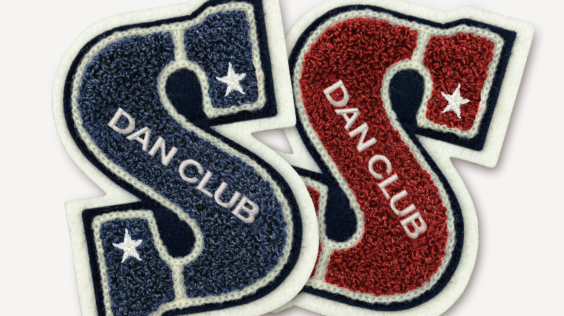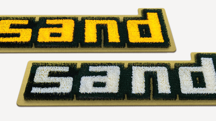 白と黒のフェルトを二枚重ね合わせてベースにした相楽刺繍のワッペンです。糸をループ状に浮かせて、ザックリとした立体感と柔らかな質感を表現し、文字周りにはチェーン刺繍を施してデザイン的なメリハリを演出しています。また、カジュアルな秋冬向けファッションに最適なワッペンです。