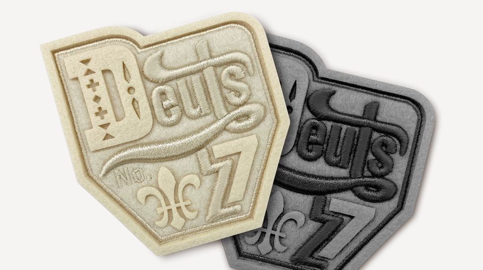 フェルトをベースにして、レーザーで抜いたモチーフを熱転写で貼り付けた後に、3D刺繍を施したワッペンです。2種類の加工技術を組み合わせた複合商品で、素材の違いによる立体感を表現しました。レーザー加工は繊細なカットが可能で、刺繍にはない奥行きを表現し、光による陰影の変化を楽しむことができます。